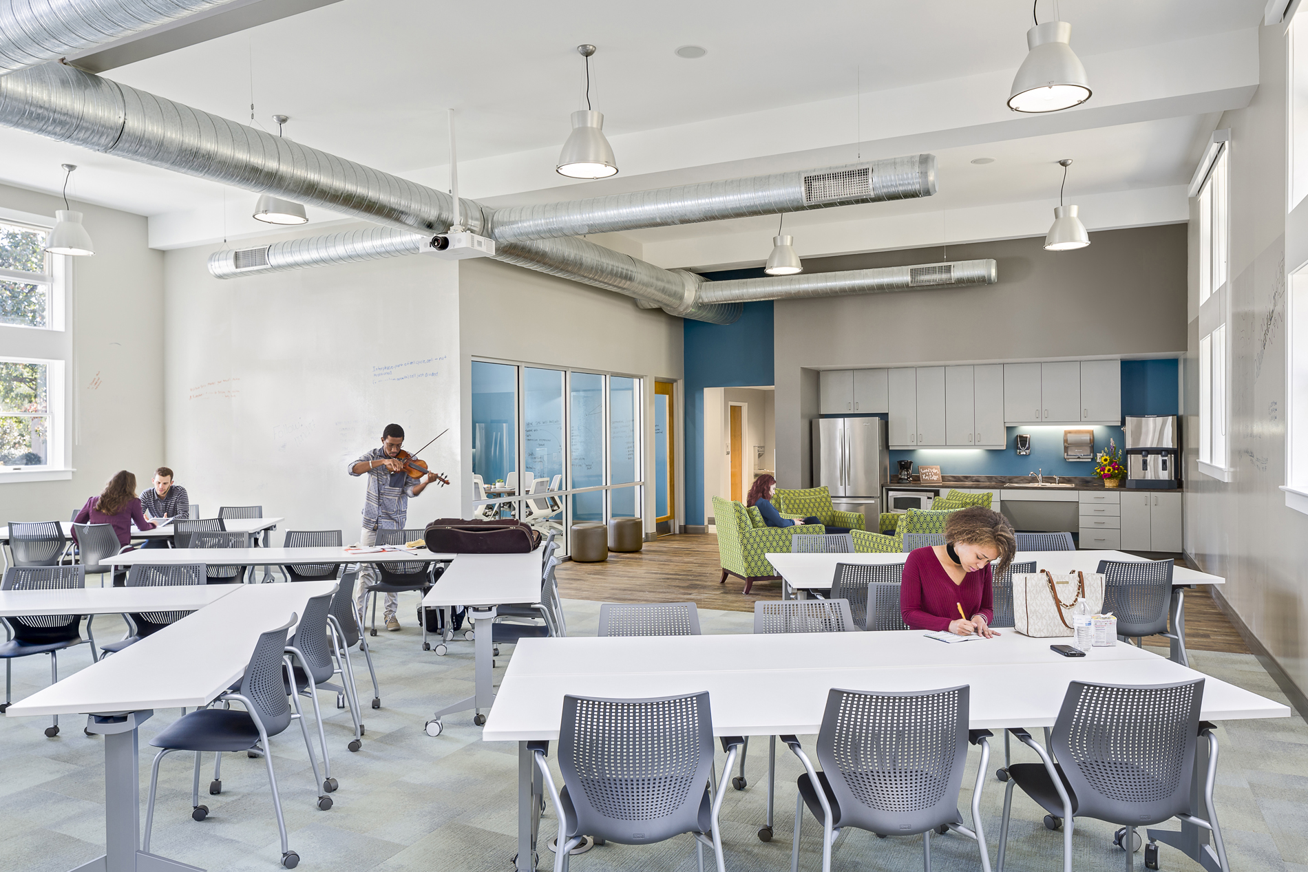 The project updated finishes and created more activity space for dorm residents. Dorm rooms in one wing of the dormitory were demolished to make room for the Professional Development Center. The newly-designed space offers classroom, meeting, and collaborative work space. In addition, the lower level snack bar was renovated into a coffee bar serving Starbucks Coffee and other prepared food items.